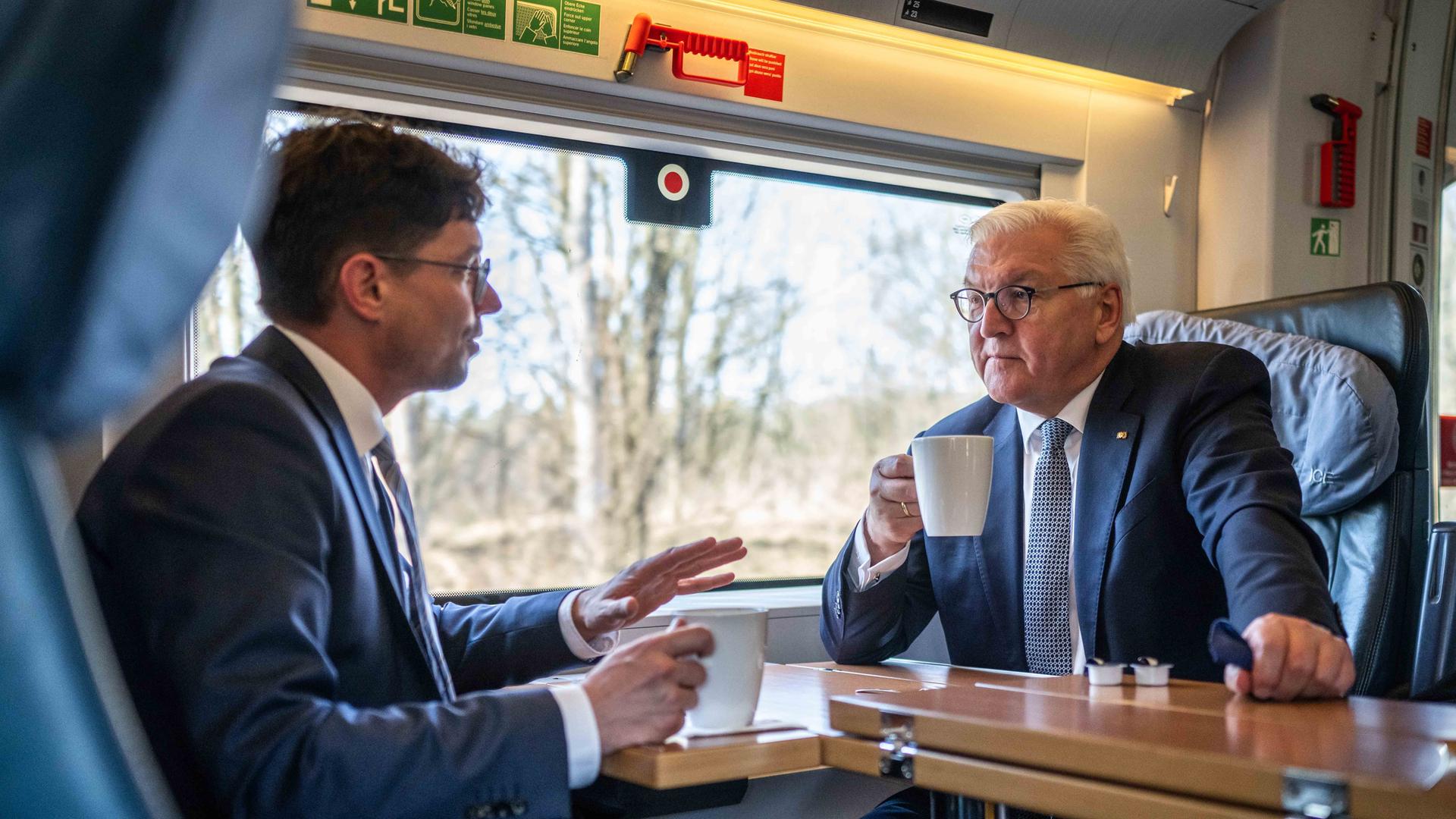PR-wirksame Anreise nach Altenburg: Bundespräsident Frank-Walter Steinmeier (r) im Gespräch mit André Neumann, dem Oberbürgermeister der Stadt. © picture alliance / dpa / Kristin Schmidt