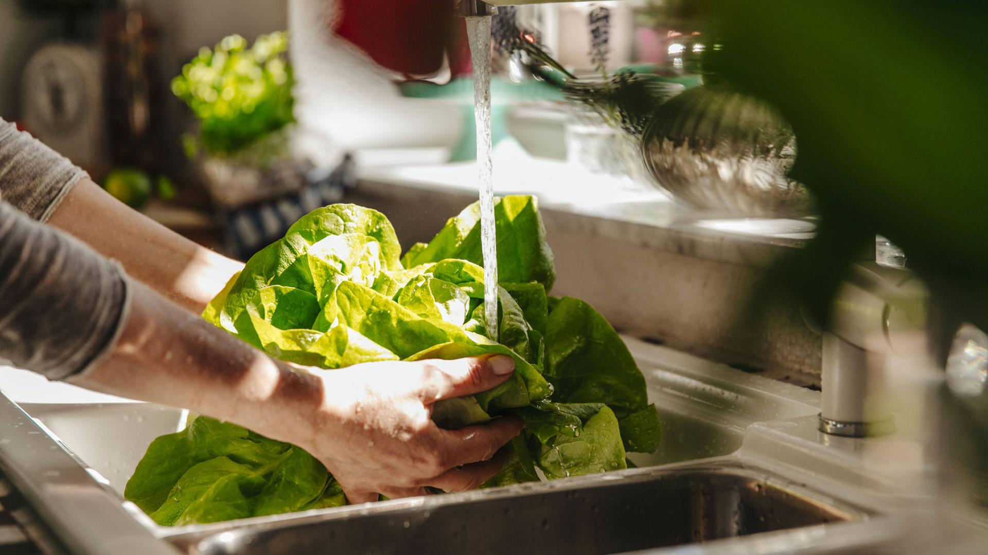 Eine Frau wäscht einen Salatkopf.