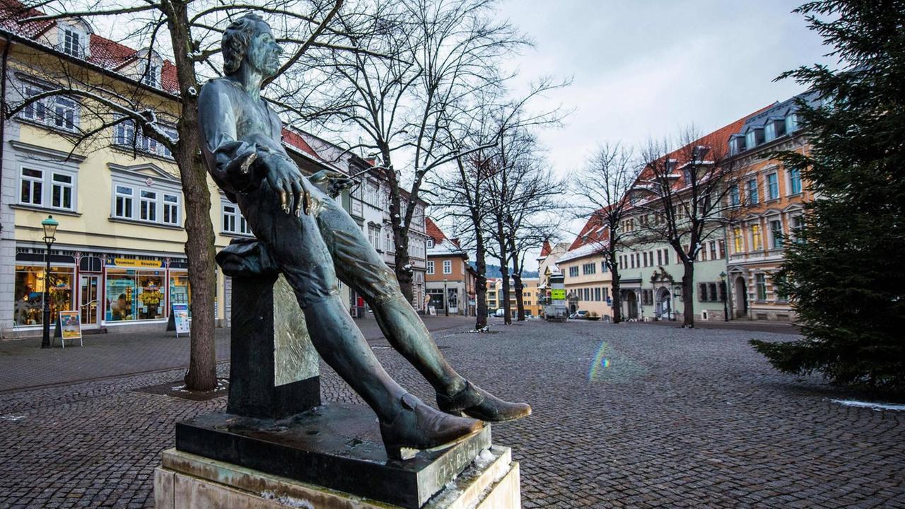 Das Bach-Denkmal auf dem Marktplatz in Arnstadt.© imago images / Steve Bauerschmidt