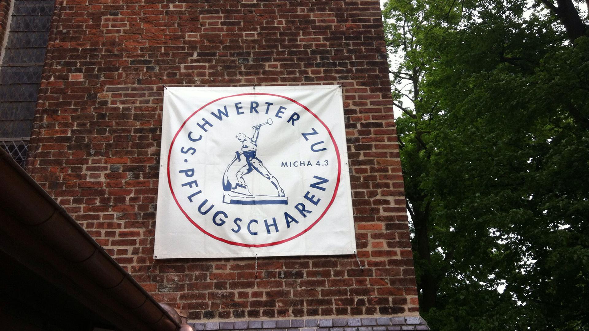 Schwerter zu Pflugscharen! Das biblische Wort, die Losung der unabhängigen Friedensbewegung in der DDR, wird von der Friedensbewegung in Westdeutschland übernommen. Auf dem Höhepunkt des Kalten Krieges wird sie zum gesamt-deutschen Ruf. Bei den Montagsdemonstrationen im Herbst 1989 ist sie einer der ersten Rufe auf den Transparenten.