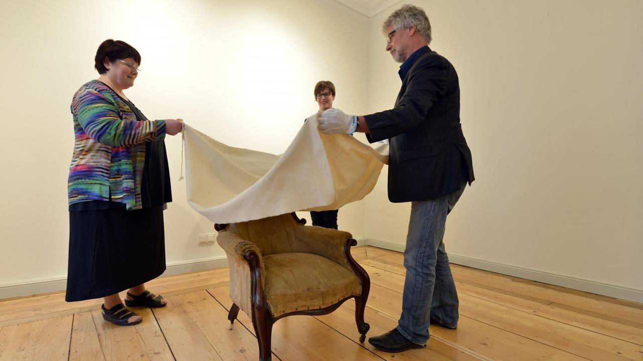 Kunsthistoriker Peter Pfister (r) von der Friedrich-Ebert-Stiftung und Elisabeth Neu, Leiterin Karl-Marx-Museum Trier, enthüllen den Lesesessel von Karl Marx in dessen Geburtshaus. © dpa