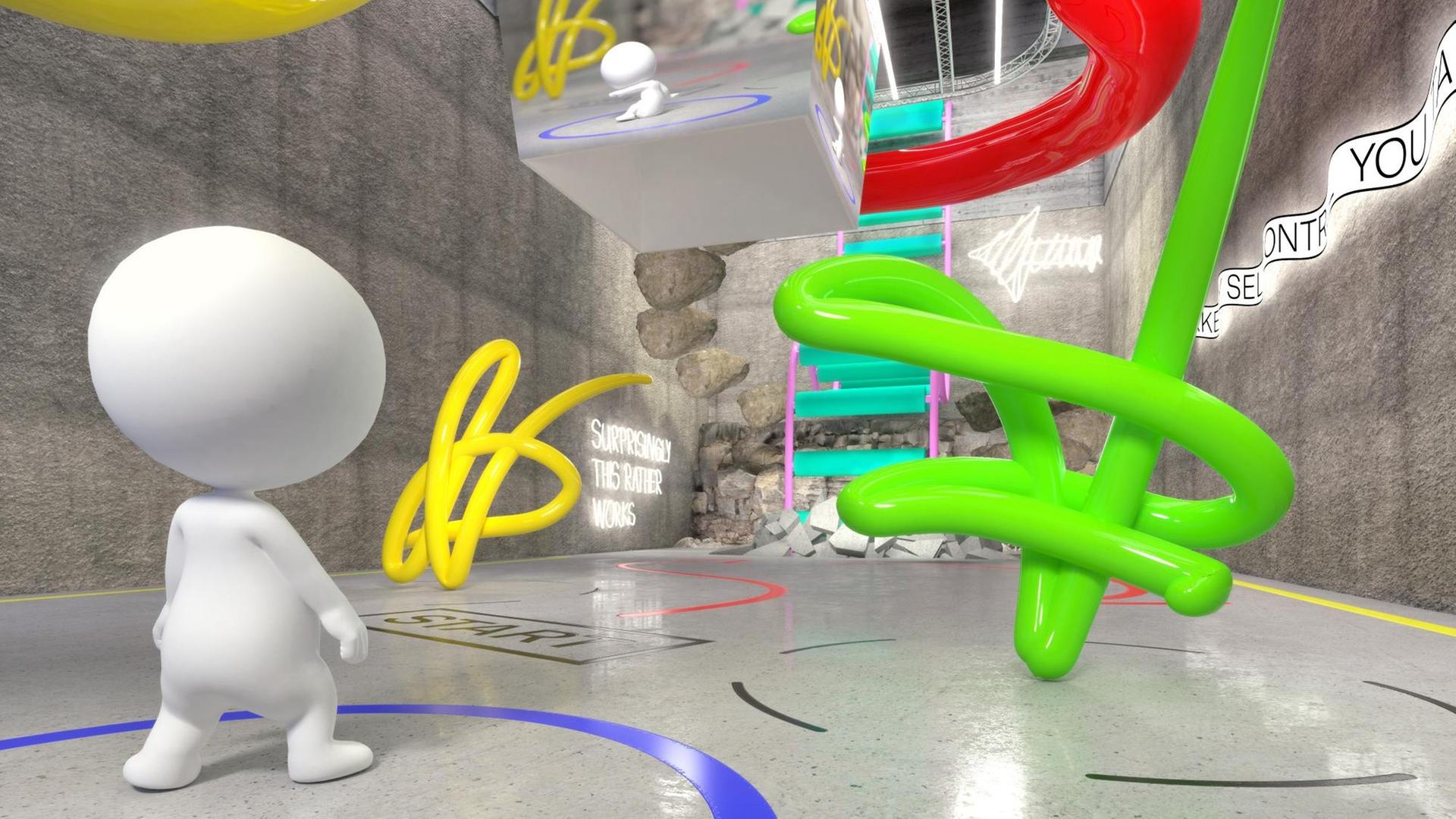 Mit einem Avatar kann eine riesige virtuelle 3D-Struktur des Berliner VR-Künstlers Manuel Rossner wie bei einem Jump ’n’ Run-Game erkundet werden: laufend, kletternd, springend.
