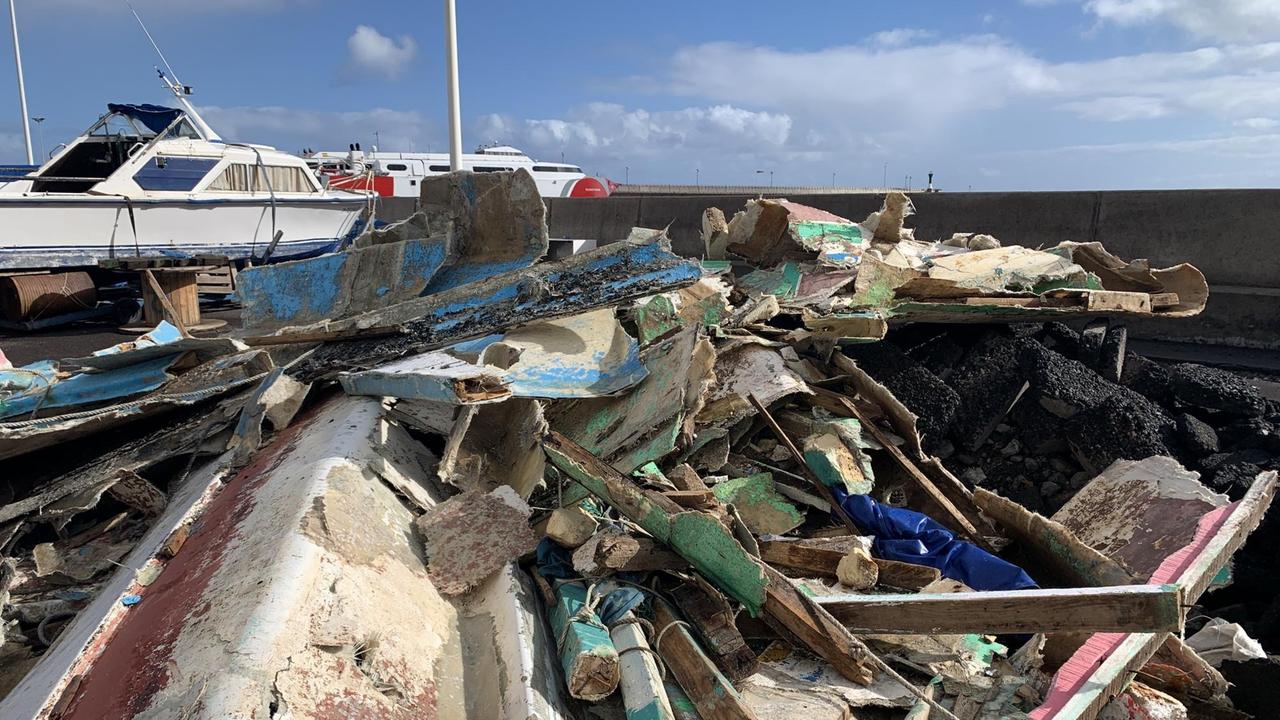 Gestrandet: Flüchtlingsbootteile im Hafen von La Estaca auf El Hierro.© Deutschlandradio / Christina Teuthorn-Mohr