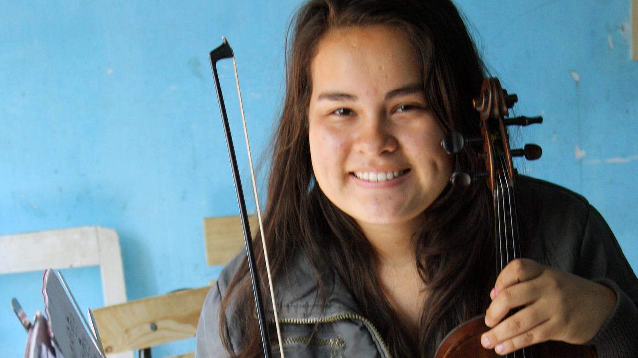 In der Probenpause setzt sich ein langhaariges Mädchen draußen im Hof auf ein Mäuerchen, unter einen Baum mit ausladender Krone. In der Hand hält es seine bunte Blechgeige. Natalia Dominguez ist 15 und spielt im Orchester, seit dieses vor drei Jahren mit den besten Schülern der Musikschule gegründet wurde.