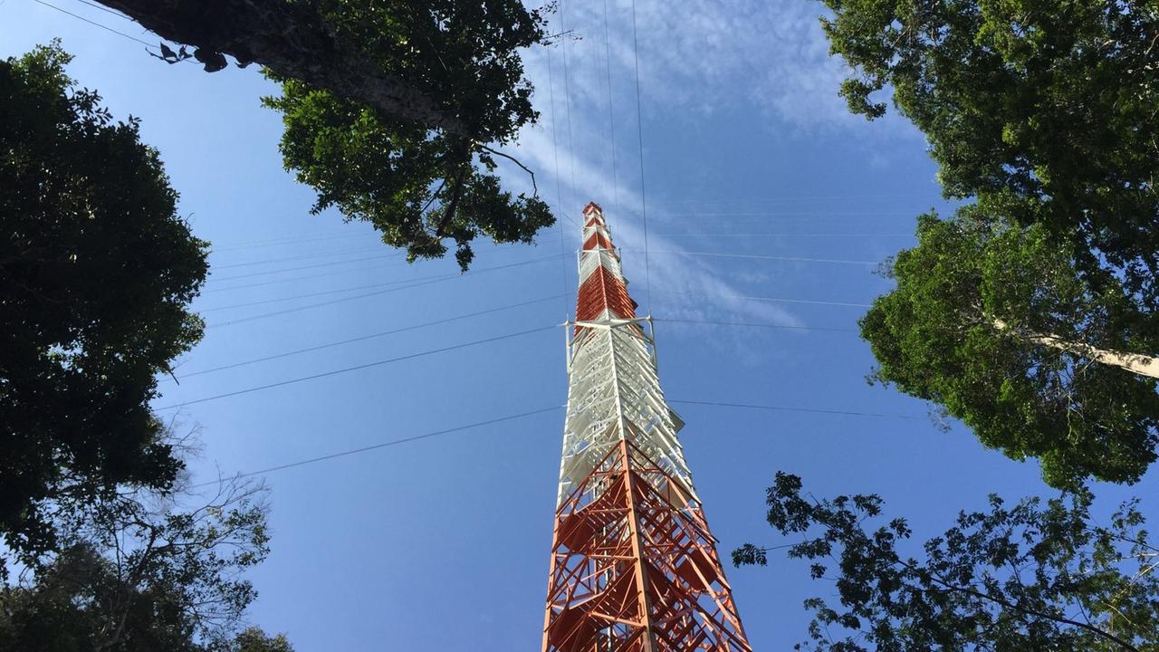 Nach insgesamt einer Stunde Fußmarsch ist die Gruppe am Ziel. Vor uns erhebt sich ein Metallgerüst. Der Messturm ist 54 Meter hoch. Er liefert Tag und Nacht Daten. Um auf die Spitze zu gelangen, muss man viele Leitern erklimmen. Nicht allen ist die Höhe geheuer. Oben angekommen weht ein leichtes Lüftchen und der Ausblick ist atemberaubend. Auf der Plattform, gut 15 Meter oberhalb der höchsten Bäume, wartet Klimaforscher Antonio Manzi, der die Messungen hier leitet.