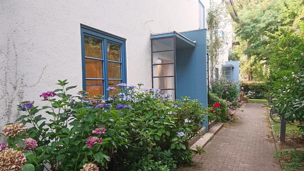 Besitzer eines Ernst-May-Hauses ist Heiner Georgsdorf, emeritierter Professor für Kunstdidaktik, durch seine Heirat geworden. Das war im Jahr 1970. Seine Frau Annette, seinerzeit Kunsterzieherin, wohnt seit Kindertagen, seit den späten Dreißigern, in diesem zweigeschossigen schmalen Reihenhaus mit dem Flachdach, seinem Dachgarten und dem Gartenstreifen. Der sorgt für eine angenehme Distanz zur gegenüberliegenden Häuserzeile. Annette Georgsdorf: